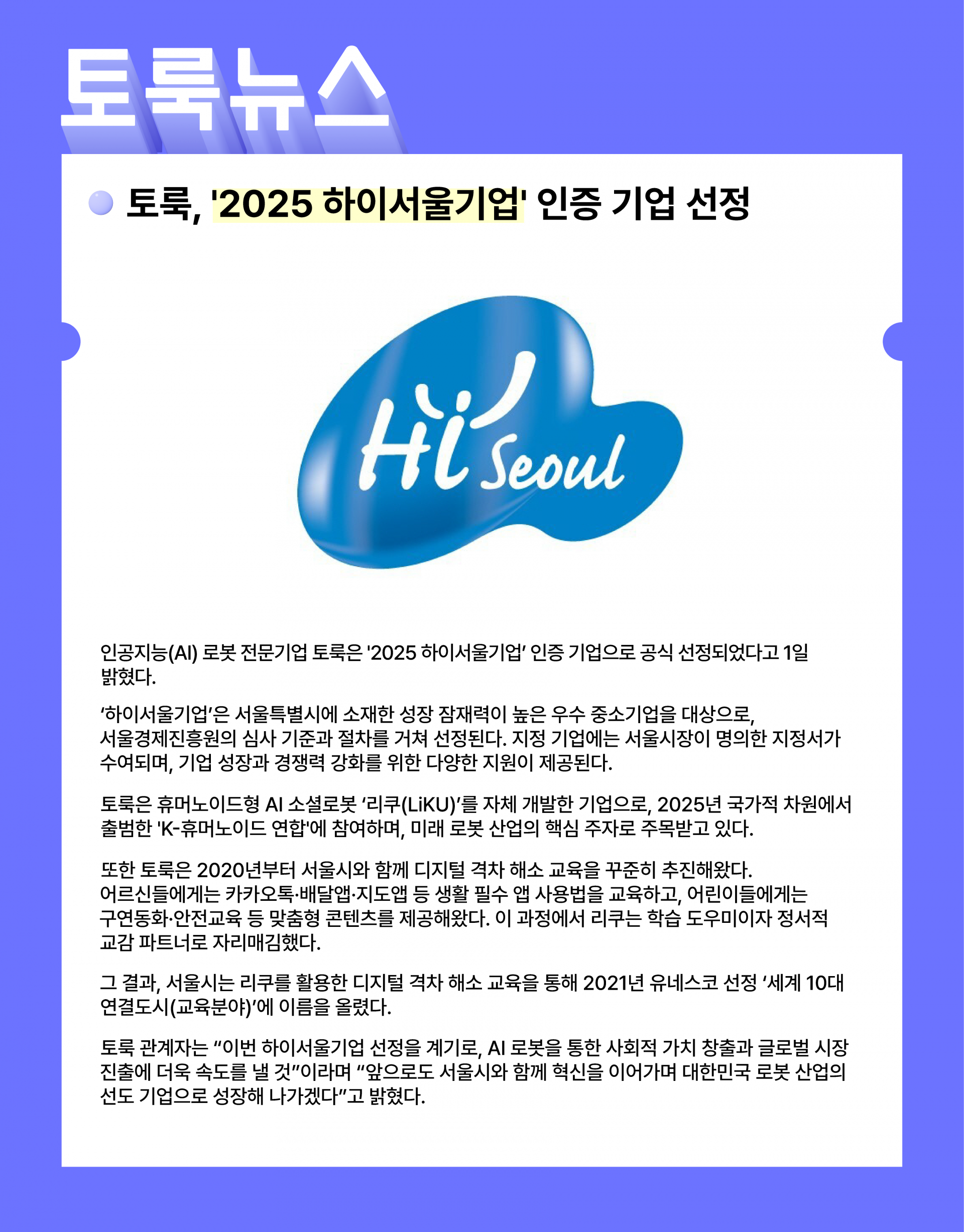 토룩, '2025 하이서울기업' 인증 기업 선정